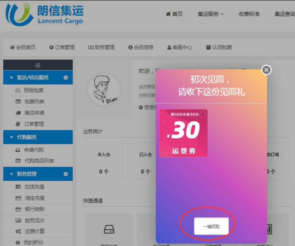 2.优惠券设置完毕,满足优惠券设定规则的用户登录进入会员中心,集运系统自动弹出优惠券,