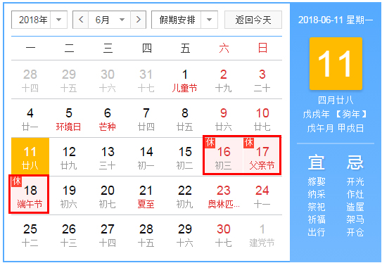 一、放假时间:2018年6月16日(周六)至6月18日(周一)。6月19日正常上班。