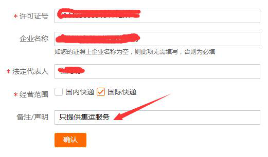 点击确定后,勾选经营范围(集运一般勾选国际快递),在备注信息里面填写:只提供集运服务,如图所示