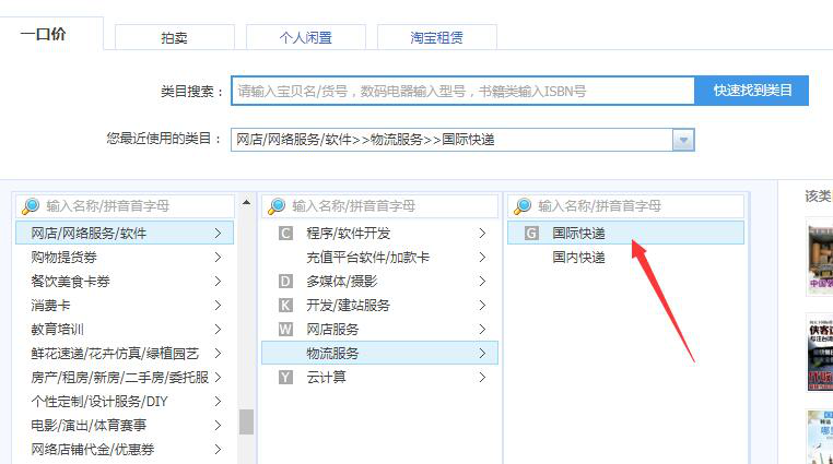 B,店铺增加新宝贝,发布在类目“网店/网络服务/软件>>物流服务>>国际快递”里: