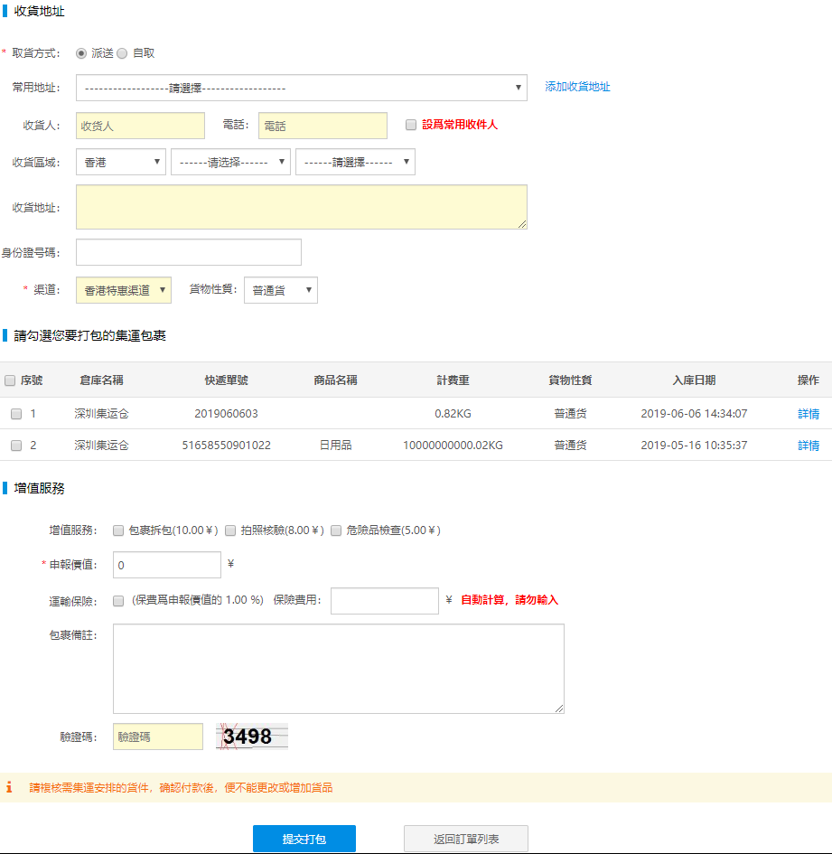 第二步:单个包裹,用申请的账号登录,打开“預報包裹”,将您买到货品的快递公司及快递单号和物品品名输入并提交。注意:选择对应收货仓库。