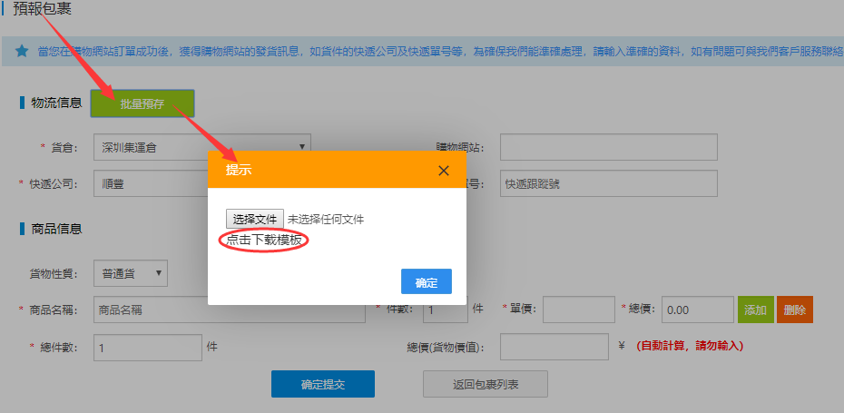 第三步:多个包裹,選擇“批量預存”,彈出提示窗口,“点击下载模板”,填写表格,然后“选择文件”上传,确定。