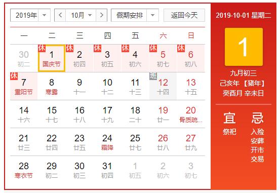 根据国家法定假期的规定,并结合公司实际情况,现对2019年国庆节节放假做出安排,具体如下: