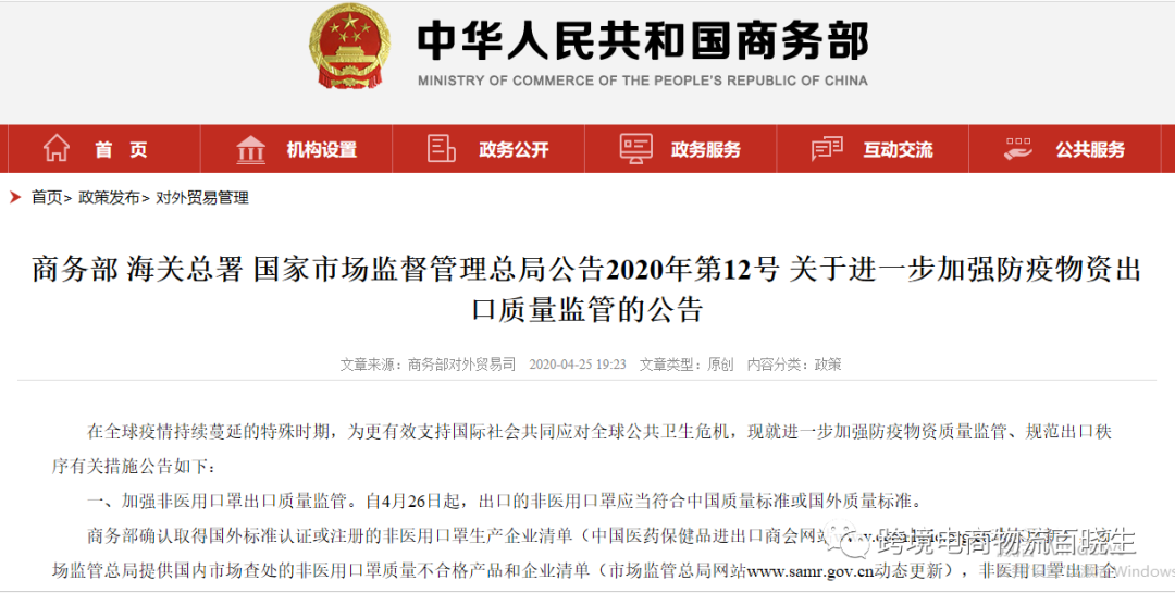 昨晚七点半时,在大伙刚吃完饭时,一条公告让行业人“心忧炭贱愿天寒”。由商务部会同海关总署和国家市场监督管理总局正式发布《2020年第12号公告》, 紧急宣布进一步加强防疫物资出口质量监管!